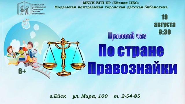 В модельной центральной городской детской библиотеке 19 августа пройдёт правовой час «По стране Правознайки». Юные читатели узнают историю появления важного документа Конвенции о правах ребенка, получат знания о правах детей, о ценности человеческой жизни, навыках правильного и безопасного поведения. Для закрепления полученных знаний ребятам предложат окунуться в мир сказок и посмотреть на сказочные события с точки зрения права.